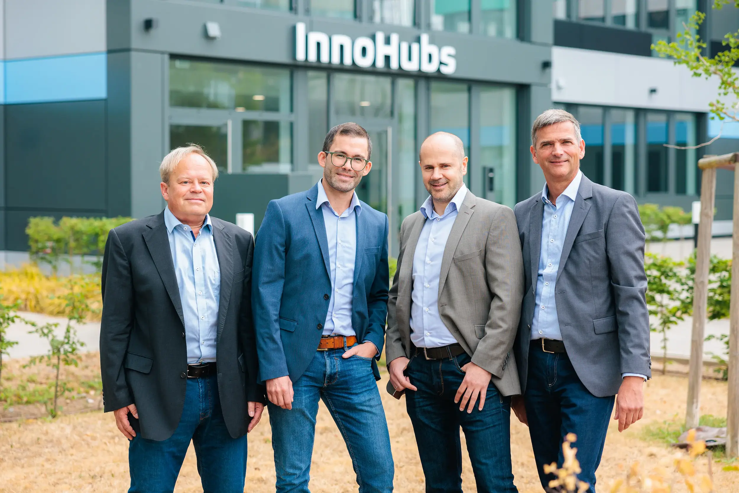Mehrere Personen stehen gemeinsam vor einem Gebäude mit der Aufschrift „InnoHubs“.